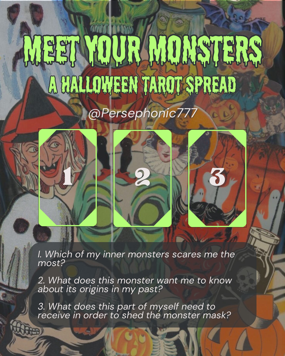 Three card spread with the following questions: Which of my inner monsters scares me the most? What does this monster want me to know about its origins in my past? What does this part of myself need to receive in order to shed the monster mask?